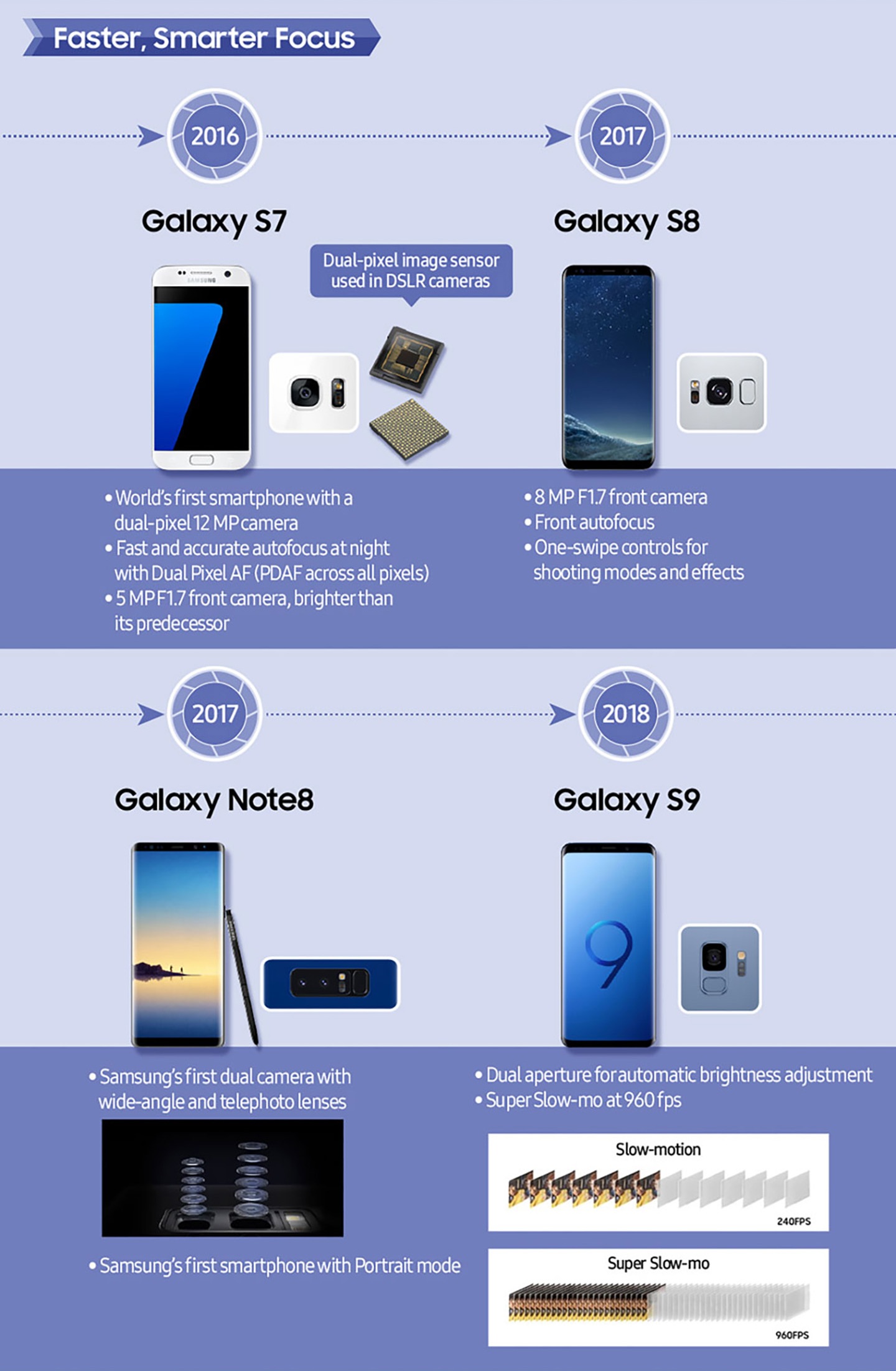 Galaxy S7 je bil prvi pametni telefon z Dual Pixel senzorjem, poznanim iz DSLR-fotoaparatov, kar je pomenilo velik korak naprej v hitrosti ostrenja in kakovosti fotografij. Galaxy Note8 je nato uvedel dvojno glavno kamero in tako tlakoval pot današnjemu trendu več kamer na pametnih telefonih.