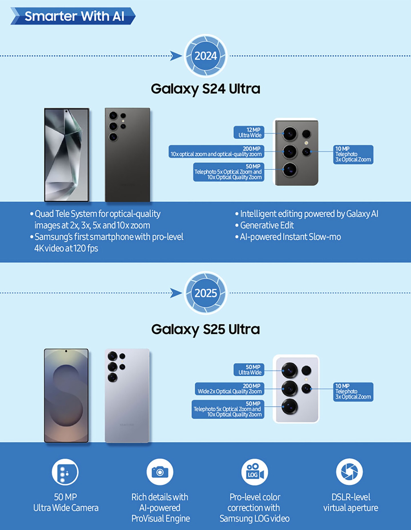 Podjetje Samsung Electronics je že od samih začetkov v ospredju razvoja mobilnih kamer. Že leta 2010 se je prvi model Galaxy S serije ponašal z glavno kamero s 5 milijoni slikovnih pik, danes pa s telefonom Galaxy S25 Ultra prihajamo do izjemne kamere z ultra visoko ločljivostjo 200 milijonov slikovnih pik, širokokotne kamere z 50 milijoni slikovnih pik ter niza naprednih orodij Galaxy AI za urejanje posnetkov. Skozi leta Samsung neprestano premika meje in postavlja nove standarde tega, kar lahko ponudi kamera pametnega telefona.