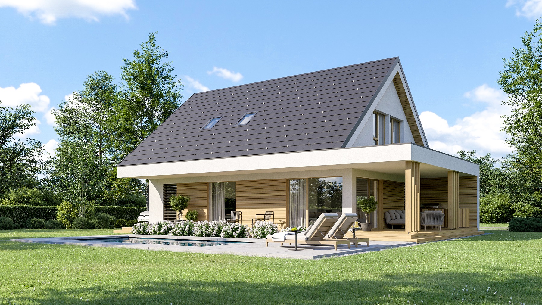 Pritlična hiša združuje klasično arhitekturno zasnovo z napredno tehnologijo trajnostne gradnje Lumar. Njena preprosta, simetrična oblika z dvokapno streho naklona 30° brez napuščev se harmonično vklaplja v okolje, hkrati pa omogoča sodobno odprto notranjo zasnovo. Svetla višina pritličja znaša 250 cm, dnevno-bivalni del pa je odprt do slemena, kar ustvarja zračen in prostoren ambient. S skupno neto površino 167 m² ponuja hiša popolno ravnotežje med funkcionalnostjo in udobjem. Z izbranimi materiali, kakovostnim stavbnim pohištvom ter premišljenimi detajli je popolna izbira za vse, ki iščejo toplino, učinkovitost in brezčasno estetiko v enem.