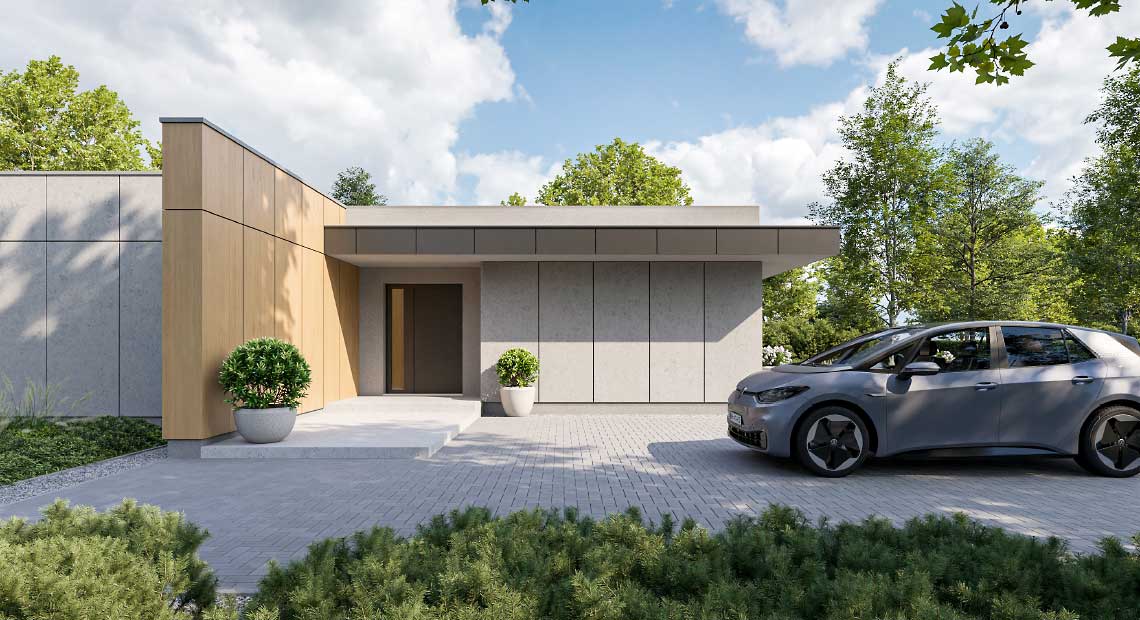 - Voden ogled hiše individualne pritlične hiše Lumar – zasnovo in individualno prilagajanje so izvedli v Lumarjevem arhitekturnem biroju.