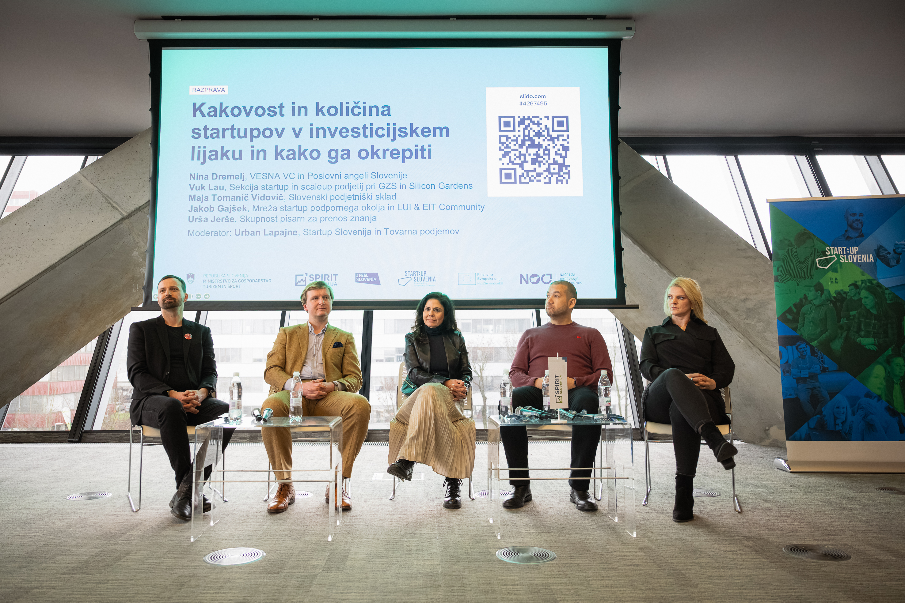 Razpravo je moderiral Urban Lapajne (Start:up Slovenija), sodelovali pa so Nina Dremelj (Vesna VC, Poslovni angeli Slovenije), Vuk Lau (Silicon Gardens, GZS), Maja Tomanič Vidovič (Slovenski podjetniški sklad), Jakob Gajšek (mreža startup podpornega okolja, LUI & EIT Community) in Urša Jerše (Skupnost pisarn za prenos znanja).