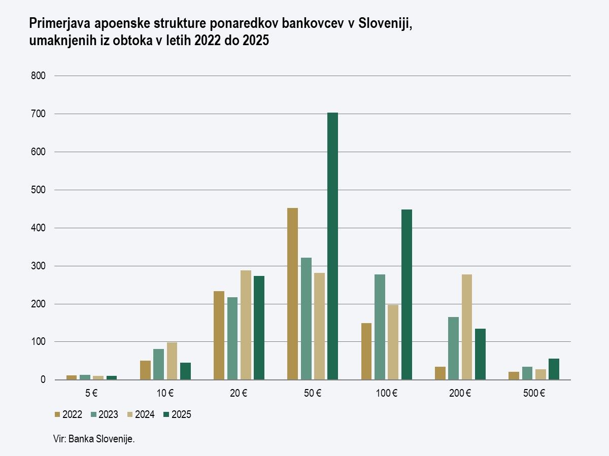 Medtem ko pri kovancih še naprej ostaja najpogosteje ponarejen kovanec apoena 2 € (slabih 82 odstotkov vseh ponarejenih kovancev), se je pri bankovcih v letu 2025 povečalo število umaknjenih evrskih bankovcev apoenov 50 € in 100 €. Skoraj za polovico pa se je zmanjšalo število umaknjenih evrskih bankovcev apoena 200 €. Skupna vrednost odkrite ponarejene evrske gotovine se je povečala za približno 28 odstotkov in znaša 140.935 EUR.