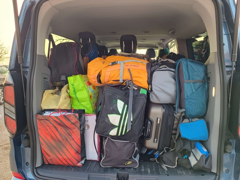 Kljub temu smo jo uspeli kakovostno napolniti vse do roba sedežev. Med prtljago je bilo namreč kar nekaj priboljškov za slovensko predstavitev na nacionalnem večeru, manjkali niso niti promocijski materiali. Pred začetkom vožnje se je voznik še malo bal, kako bodo v drugi vrsti sedeli trije odrasli, a izkazalo se je, da več kot odlično: prostora v širino je bilo več kot dovolj, sedenje je visoko, prostora nad glavo na pretek, noge so vsi lahko po potrebi stegnili.