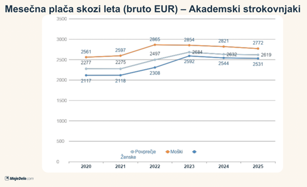 Podatki med akademskimi strokovnjaki kažejo pozitiven trend pri uravnavanju plač med spoloma. Če je lani razlika v bruto plači znašala 277 evrov, se je letos zmanjšala na 241 evrov, kar pomeni približno 13-odstotno zmanjšanje razlike. "To nakazuje na postopno večjo uravnoteženost plač v poklicih z višjo stopnjo izobrazbe, kjer so sistemi nagrajevanja pogosto bolj strukturirani in transparentni," razlaga Maja Kmet.