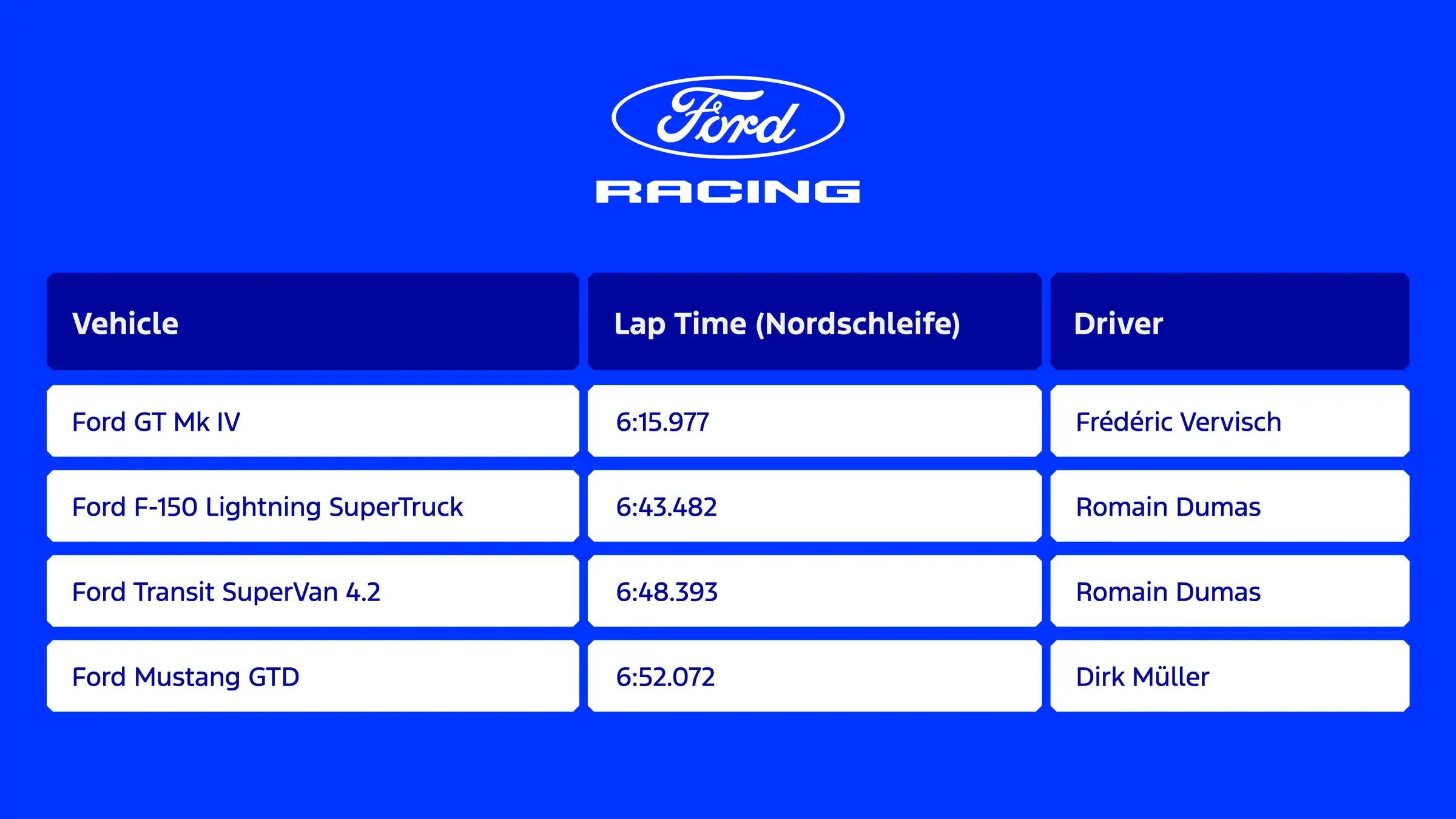 A ne gre le za čase krogov – gre za našo neomajno zavezanost dirkanju, inovacijam in zagotavljanju vznemirljivih doživetij našim strankam. Ford Racing pomeni premikanje meja, učenje in nenehni razvoj. Dosežek Forda GT Mk IV na Nürburgringu jasno izraža naše ambicije in ponuja vznemirljiv vpogled v prihodnost športnih vozil. Dirkamo, da bi zmagali, dirkamo, da se učimo, in dirkamo, da bi ta zmagovalni duh prinesli vsem, ki imajo radi znamko Ford.